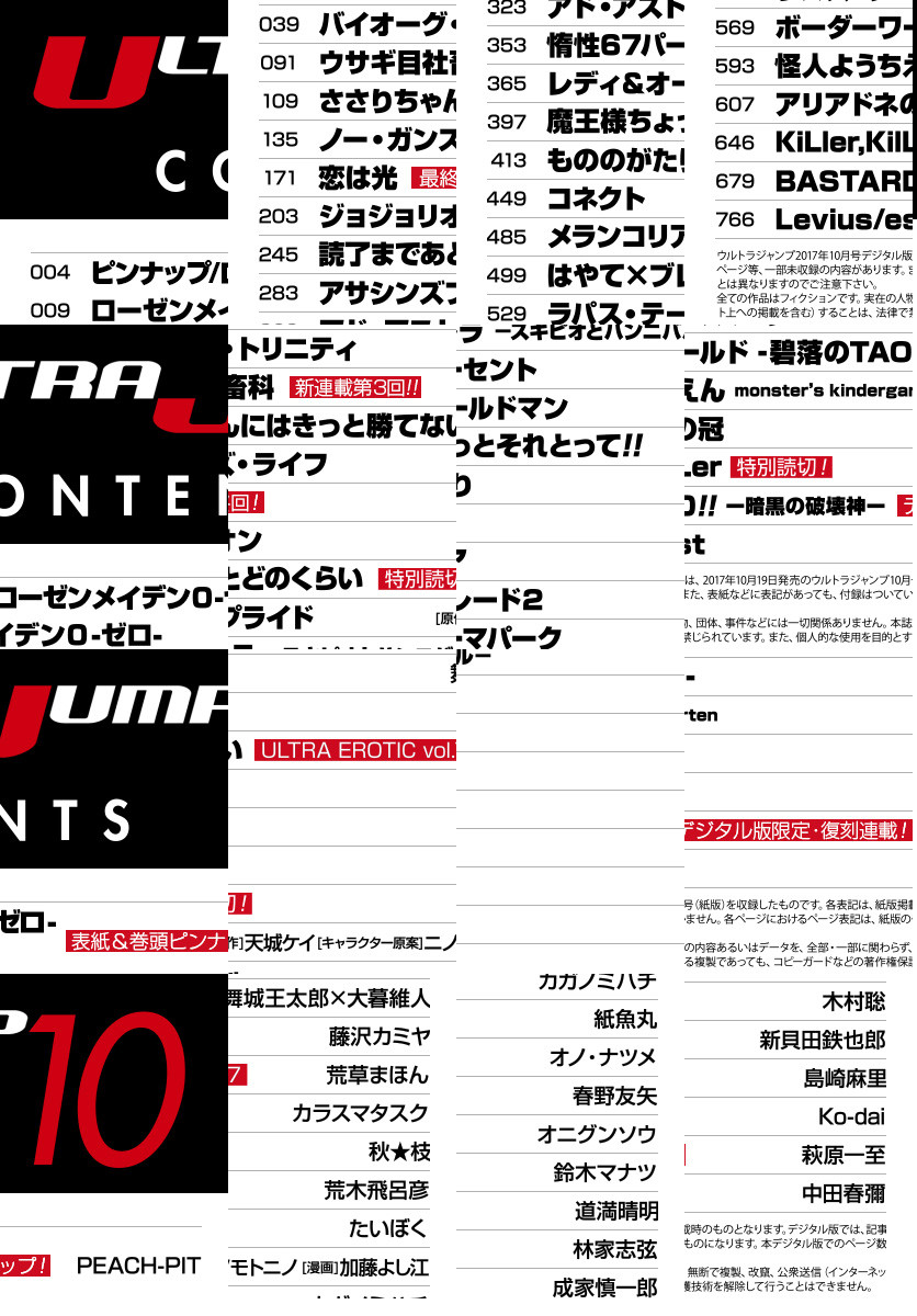 ●表紙&巻頭ピンナップで登場! 誕生15周年を記念し、9月15日から10月31日まで「ローゼンメイデン0—ゼロ—展」も開催! 帝都に潜む謎、さらに深まる! 『ローゼンメイデン0—ゼロ—』(PEACH-PIT) ●「恋の光」が視える青年と、恋を知りたい女の子。2人が出会って始まった微妙な恋の物語がついに完結! 『恋は光』(秋★枝) ●月からやってきた社畜精神あふれるウサギと、ブラック企業社員の暮らしを描く脱力系ブラック労働コメディ! 2話同時掲載! 『ウサギ目社畜科』(藤沢カミヤ) ●話題の「セクシー」読切連弾企画、第7弾! 『ULTRA EROTIC vol.7/ささりちゃんにはきっと勝てない』(荒草まほん) ●特別読切! クラスに居場所を見出せない本好き少女と、書店員の物語! 『読了まであとどのくらい』(たいぼく) ●デジタル版限定・復刻連載! 『BASTARD!! —暗黒の破壊神—』(萩原一至)他 ※「ウルトラジャンプ」デジタル版には、紙版の付録は付属しません。ご了承ください。