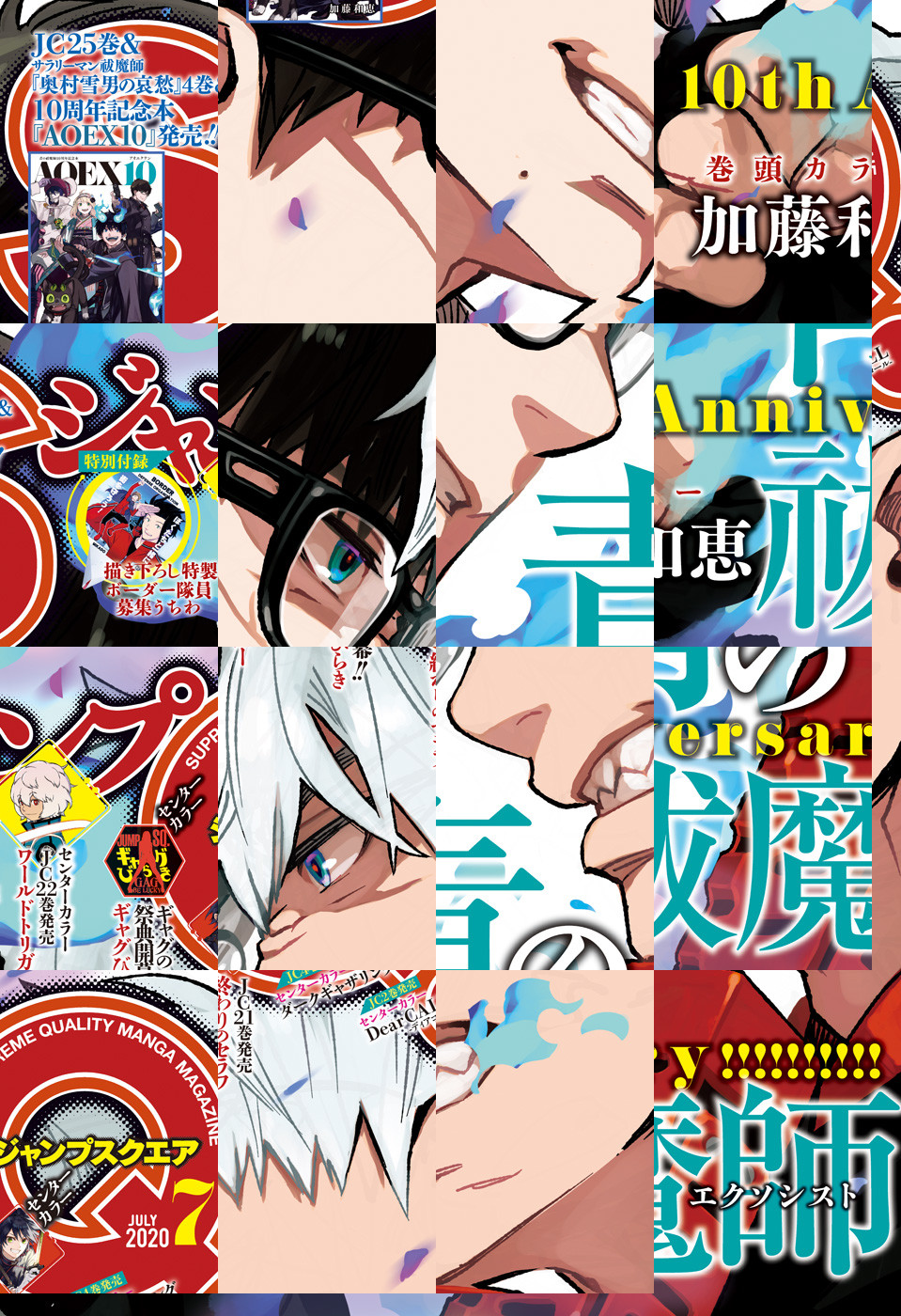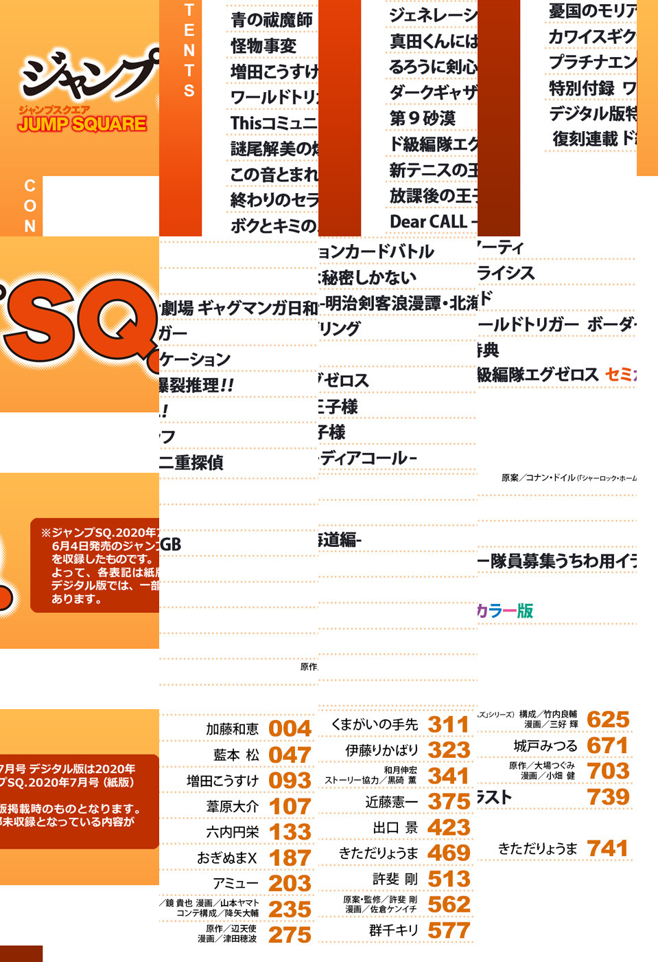 ※「ジャンプSQ.」デジタル版には、紙版の付録は付属しません。ご了承ください。 ●「ジャンプSQ.」2020年7月号は、連載10周年を迎える『青の祓魔師』を筆頭に熱いラインナップでお届け! ●最新25巻配信&新篇突入&連載10周年突破を記念して、表紙&巻頭カラー! 父と母の過去を見終え、全てを受け止めた燐。イルミナティへと渡り独自に動いていた雪男。2人の再会で、兄弟の物語が動き出す——! 『青の祓魔師』(加藤和恵) ●最新22巻配信でセンターカラー! 玉狛第二の激闘の裏で行われていたB級中位最終戦! 那須隊VS諏訪隊VS香取隊、最後の激闘の行方は? さらに特別付録として、ボーダー隊員募集うちわ用イラストを収録! 『ワールドトリガー』(葦原大介) ●センターカラーで、SQ.最大のギャグの祭典「ギャグびらき」開幕! 第1弾は、赤塚賞入選を射止めたおぎぬまX先生を含む、新進気鋭の3人が登場!! ●最新21巻配信でセンターカラー! 優・ミカと離れた戦地で動いていたフェリドとクローリー。“パパ”の気配を感じた2人は…? 『終わりのセラフ』(原作:鏡貴也 漫画:山本ヤマト コンテ構成:降矢大輔) ●最新4巻配信でセンターカラー! 次に螢多朗たちが挑む心霊スポットも、危険度Sランクの青梅市・旧Fトンネル! でもその前に、多摩川の河川敷へ! そこでは旧日本軍の霊が怨念を振りまいていて…!? 『ダークギャザリング』(近藤憲一) ●最新2巻配信でセンターカラー! 1年生が特別任務に異例の抜擢! サンソたち5人は黒山(ブラックマウンテン)での希少薬草の採集に挑む! 『Dear CALL—ディアコール—』(群千キリ) ●デジタル版限定で復刻連載中! 『ド級編隊エグゼロス セミカラー版』(きただりょうま)
