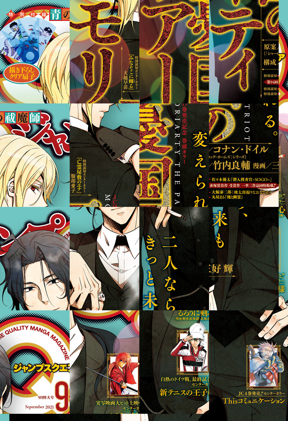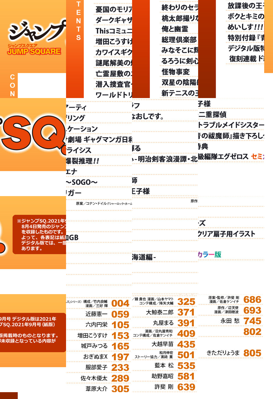 ※「ジャンプSQ.」デジタル版には、紙版の付録は付属しません。ご了承ください。/「ジャンプSQ. 2021年9月号」、紙と同時に配信!/【表紙&巻頭カラー】『憂国のモリアーティ』(原案:コナン・ドイル(「シャーロック・ホームズ」シリーズ) 構成:竹内良輔 漫画:三好輝)/【センターカラー】『Thisコミュニケーション』(六内円栄)、『るろうに剣心―明治剣客浪漫譚・北海道編―』(和月伸宏 ストーリー協力:黒碕薫)、『新テニスの王子様』(許斐剛)/【センターカラー特別読切】『亡霊屋敷のエナ』(服部愛子)、『みなそこに輝る』(大越早苗)/【特別読切】『潜入捜査官~SOGO~』(佐々木優太)、『桃太郎撮りなおしです。』(大鯨泰二郎)、『俺と幽霊』(丸屋まる)/【特別付録】『青の祓魔師』描き下ろしクリア扇子用イラスト/【デジタル版特典】復刻連載『ド級編隊エグゼロス セミカラー版』(きただりょうま)/ほか、連載12作品を収録!