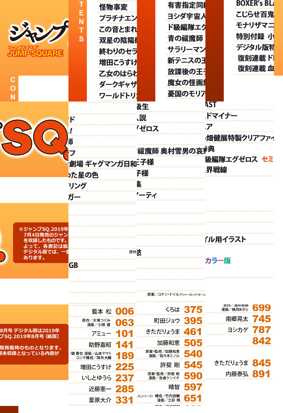 ※「ジャンプSQ.」デジタル版には、紙版の付録は付属しません。ご了承ください。 ●「ジャンプSQ.」2019年8月号は、カラー扉盛りだくさんの特大号! ●表紙は最新11巻配信開始! 神を否定する米田教授の説得に臨む明日。星が語る米田との過去に、彼を紐解く鍵が…? さらに「画業30周年記念 小畑健展 NEVER COMPLETE」7月13日(土)開催を記念して、ロングインタビュー、特製クリアファイルイラストも掲載! 『プラチナエンド』(原作:大場つぐみ 漫画:小畑健) ●大人気御礼巻頭カラー! 最新8巻の配信がスタート! 激化する結石争奪戦! 花楓たちとの死闘を制した夏羽は——? 『怪物事変』(藍本松) ●最新刊配信の5作品がセンターカラーで登場! 『双星の陰陽師』(助野嘉昭)&『乙女のはらわた星の色』(いしとゆうら)&『ド級編隊エグゼロス』(きただりょうま)&『憂国のモリアーティ』(原案:コナン・ドイル(「シャーロック・ホームズ」シリーズ) 構成:竹内良輔 漫画:三好輝)&『こじらせ百鬼ドマイナー』(南郷晃太) ●震撼覚ホラー漫画賞最優秀賞受賞作品がセンターカラー特別読切で登場! クラスメイトのヨシダの正体とは…!? 『ヨシダ宇宙人説』(町田ジョウ) ●デジタル版限定で復刻連載中! 『ド級編隊エグゼロス セミカラー版』&『血界戦線』(内藤泰弘)