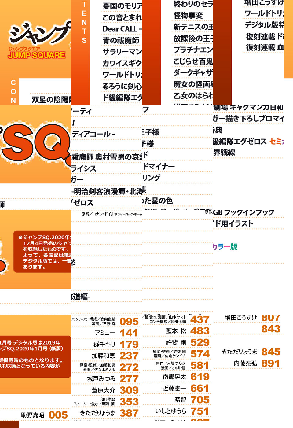 ※「ジャンプSQ.」デジタル版には、紙版の付録は付属しません。ご了承ください。 ●「ジャンプSQ.」2020年1月号は、新時代に踏み込む注目作が目白押し! ●表紙は、最新21巻配信開始! 緊迫の最終ROUND進行中! 複数の部隊が絡み合う混戦の中、包囲されたヒュースは!? 特別付録の描き下ろしブロマイド用イラストも収録! 『ワールドトリガー』(葦原大介) ●最新20巻配信開始で巻頭カラー&新章開幕! 20歳になり、活躍を続けるろくろと紅緒。二人の私生活にも進展が…? 『双星の陰陽師』(助野嘉昭) ●センターカラーでお届けの新連載第2回! 異形を友とし、島を出る決意をしたサンソが出会う新たな召喚士とは!? 『Dear CALL—ディアコール—』(群千キリ) ●センターカラー! 罪鍵の光で真祖を捉えたグレンだが…? さらに、キャラクター人気投票の結果発表&鏡先生書き下ろしシナリオも掲載! 『終わりのセラフ』(原作:鏡貴也 漫画:山本ヤマト コンテ構成:降矢大輔) ●最新4巻配信を記念してセンターカラー! 大都会・東京への修学旅行2日目! にぎやかな妖怪たちに渡される課題とは…!? 『こじらせ百鬼ドマイナー』(南郷晃太) ●連載20周年突入を記念する特別企画! ブックインブック形式でベストオブギャグ総選挙結果発表&1位エピソードの新作描き下ろしをお届け! 『増田こうすけ劇場 ギャグマンガ日和GB』(増田こうすけ) ●デジタル版限定で復刻連載中! 『ド級編隊エグゼロス セミカラー版』(きただりょうま)&『血界戦線』(内藤泰弘)