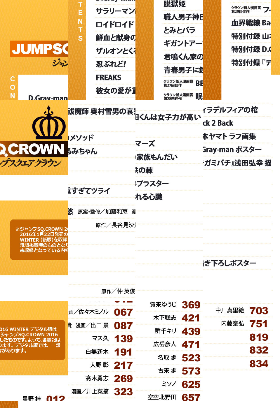 ※デジタル版には、紙版の付録は付属しません。ご了承ください。 ●「ジャンプSQ.」の季刊新増刊第3号「ジャンプSQ.CROWN 2016 WINTER」デジタル版が紙の発売と同日に登場!! ●表紙&巻頭カラー&描き下ろしポスター特別収録! TVアニメ新シリーズ放送決定で話題の星野桂『D.Gray-man』!! ●センターカラーには第2シーズンも絶好調の内藤泰弘『血界戦線 Back 2 Back』!! ●センターカラー! SQ.編集部震撼のダークファンタジー高木勇志『FREAKS』!! ●特別付録! 門外不出の作画過程が明かされる山本ヤマト ラフ画集&『テガミバチ』の浅田弘幸描き下ろしポスター!! ●強豪作品大集合! 第3号も漫画の最前線を突き進む!!