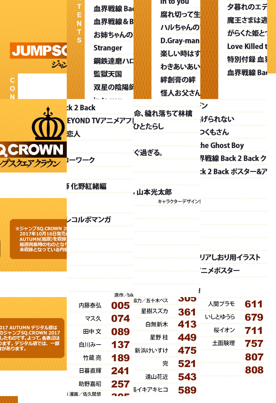 ※デジタル版には、紙版の付録は付属しません。ご了承ください。 ●TVアニメ『血界戦線 & BEYOND』放送開始を記念して、表紙&ポスターで登場! 秘密結社ライブラが新たな事件に挑む! 内藤泰弘『血界戦線 Back 2 Back』 ●SQ.本誌との同時連載、センターカラーで贈る第2回! 明かされる紅緒の正体! 「双星」に隠されたシステムとは…? 助野嘉昭『双星の陰陽師 化野紅緒編』 ●センターカラー! ジョニーの呼びかけに応え、自身の肉体を取り戻したアレンだが——? 星野桂『D.Gray-man』 ●ネットで大きな話題を呼んだ注目作家の最新読切が巻中カラーで登場! 人間プラモ『夕暮れのエデン』 ●そのほか、漫画界を駆けあがる若き才能が集う、新人作家読切も10本以上掲載!!