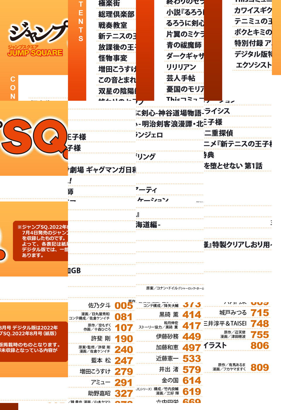 ※「ジャンプSQ.」デジタル版には、紙版の付録は付属しません。ご了承ください。/「ジャンプSQ. 2022年8月号」、紙と同時に配信!/【表紙&センターカラー】『新テニスの王子様』(許斐剛)/【新連載&巻頭カラー】『極楽街』(佐乃夕斗)/【センターカラー】『戦奏教室』(原作:空もずく 作画:十森ひごろ)、『片翼のミケランジェロ』(伊藤砂務)、『ボクとキミの二重探偵』(原作:辺天使 漫画:津田穂波)/【特別読切】『リリリアン』(井出渚)/【特別付録】アニメ『新テニスの王子様』特製クリアしおり(デジタル版はイラストとして巻末に収録)/【デジタル版特典】『エクソシストを堕とせない』第1話(原作:有馬あるま 漫画:フカヤマますく)/ほか、13作品を収録!