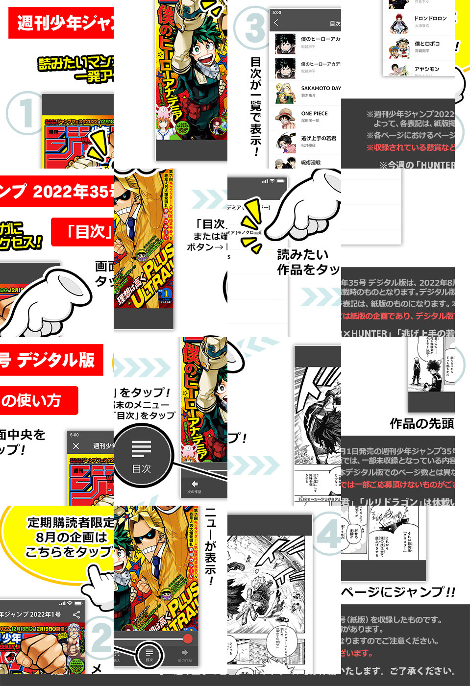 ※「逃げ上手の若君」「ルリドラゴン」は休載となります。【記事ページ】も毎号収録!/巻頭カラーは、劇場版「ONE PIECE FILM RED」8月6日(土)公開超直前!!『ONE PIECE』/連載再開!!&最終章“最強の魔法帝に至る者”突入見開きセンターカラー!!『ブラッククローバー』/転職してきた霊媒師が挑むのは…!?異業種霊媒サスペンス読切センターカラー47ページ!『霊媒師の心理学』/集う金級!!スパイ協会編超白熱センターカラー!!『夜桜さんちの大作戦』/※デジタル版では、綴じ込み付録・シリアルコードなど一部未収録となっている内容があります。※収録されている懸賞などは紙版の企画であり、デジタル版では一部ご応募頂けないものがございます。