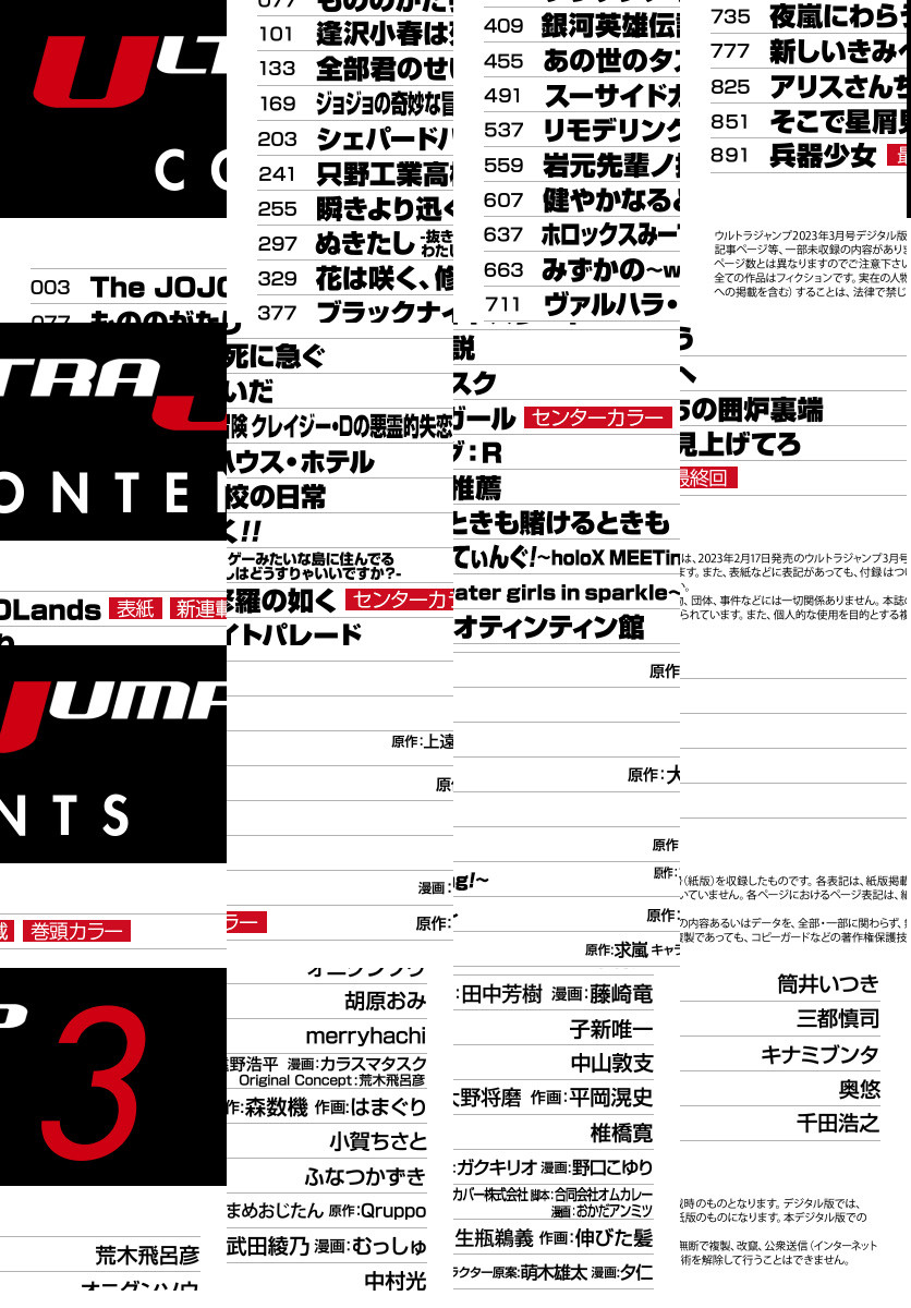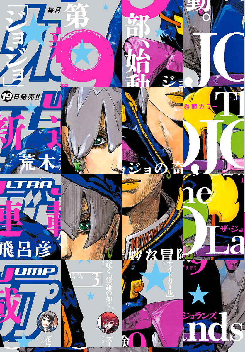 「ウルトラジャンプ 2023年3月号」、紙と同時に配信!/【表紙&新連載&巻頭カラー】ジョジョの奇妙な冒険 第9部『The JOJOLands』(荒木飛呂彦)/【センターカラー】『花は咲く、修羅の如く』(原作:武田綾乃 漫画:むっしゅ)、『スーサイドガール』(中山敦支)/【最終回】『兵器少女』(千田浩之)/ほか、21作品を掲載!