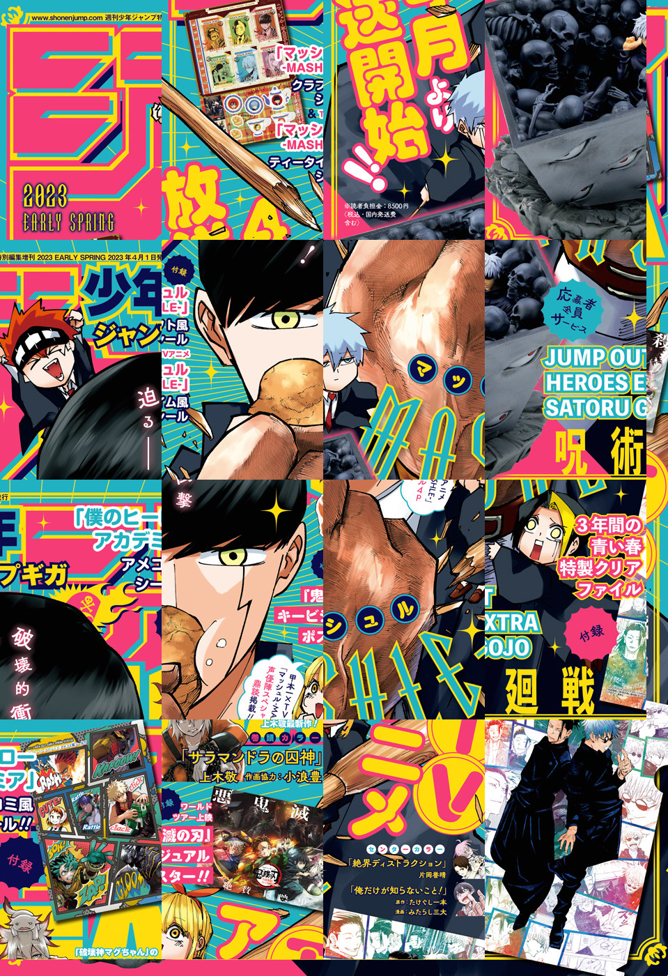 ※「ジャンプGIGA」デジタル版には、紙版の付録は付属しません。応募者全員サービスのご応募はアプリ版の少年ジャンプ+、アプリ版のゼブラックからのみ可能です。ご了承ください。/週刊少年ジャンプ特別編集増刊「ジャンプGIGA 2023 EARLY SPRING」、紙と同時に配信!/【巻頭カラー】『サラマンドラの囚神』(上木敬 作画協力:小浪豊)/【センターカラー】『俺だけが知らないこと!』(原作:たけぐし一本 漫画:みたらし三大)、『絶界ディストラクション』(片岡誉晴)/【付録】『僕のヒーローアカデミア』アメコミ風シール!!、『マッシュル-MASHLE-』クラフト風シール・TVアニメ『マッシュル-MASHLE-』ティータイム風シール、『呪術廻戦』3年間の青い春特製クリアファイル、『呪術廻戦』JUMP OUT HEROES EXTRA SATORU GOJO 原作再現フィギュアポスター、『ワールドツアー上映「鬼滅の刃」上弦集結、そして刀鍛冶の里へ』絶賛上映中記念キービジュアルポスター!!(デジタル版はイラストとして巻末に収録)/ほか、多数の新作読切を掲載!