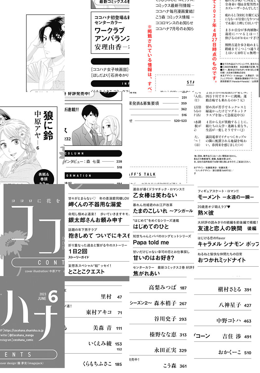 ★実写映画「おとななじみ」公開&最新4巻発売記念! 表紙&巻頭カラー 中原アヤ「狼に鈴」 ★ココハナ初登場&新連載! センターカラー 安理由香「ワークラブアンバランス」 ★最新コミックス2巻発売! センターカラー こう森「焦がれあい」 ★大好評の読みきりの続編を前後編で掲載! 中野コトハ「友達と恋人の狭間 後編」 ★里村「岬くんの不器用な溺愛」 ★東村アキコ「銀太郎さんお頼み申す」 ★美森青「抱きしめて ついでにキスも」 ★いくえみ綾「1日2回」 ★くらもちふさこ「とことこクエスト」 ★高梨みつば「乙女椿は笑わない」 ★森本梢子「たまのこしいれ」 ★谷川史子「はじめてのひと」 ★榛野なな恵「Papa told me」 ★永田正実「甘いのはお好き?」 ★槇村さとる「モーメント 永遠の一瞬」 ★八神星子「熟×彼」 ★吉住渉「キャラメル シナモン ポップコーン」 ★おかくーこ「おつかれミッドナイト」 ★石井ゆかり「ほしだより」 ※紙版に掲載されている作品・記事が、都合により電子版では掲載がない場合があります。