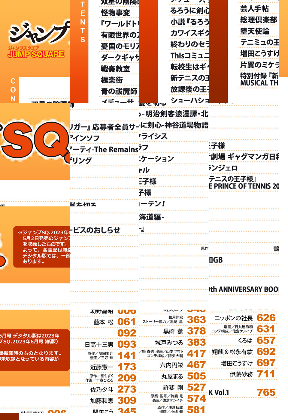 ※「ジャンプSQ.」デジタル版には、紙版の付録は付属しません。ご了承ください。/「ジャンプSQ. 2023年6月号」、紙と同時に配信!/【表紙】『怪物事変』(藍本松)/【巻頭カラー】『双星の陰陽師』(助野嘉昭)/【センターカラー】『有限世界のアインソフ』(日高十三男)、『カワイスギクライシス』(城戸みつる)、『新テニスの王子様』(許斐剛)、『増田こうすけ劇場 ギャグマンガ日和GB』(増田こうすけ)/【特別読切】『メデューサ、髪を切る』(関矢こう)、『転校生はギャル』(丸屋まる)/【特別付録】『新テニスの王子様』MUSICAL THE PRINCE OF TENNIS 20th ANNIVERSARY BOOK Vol.1(デジタル版は巻末に収録)/ほか、13作品を収録!