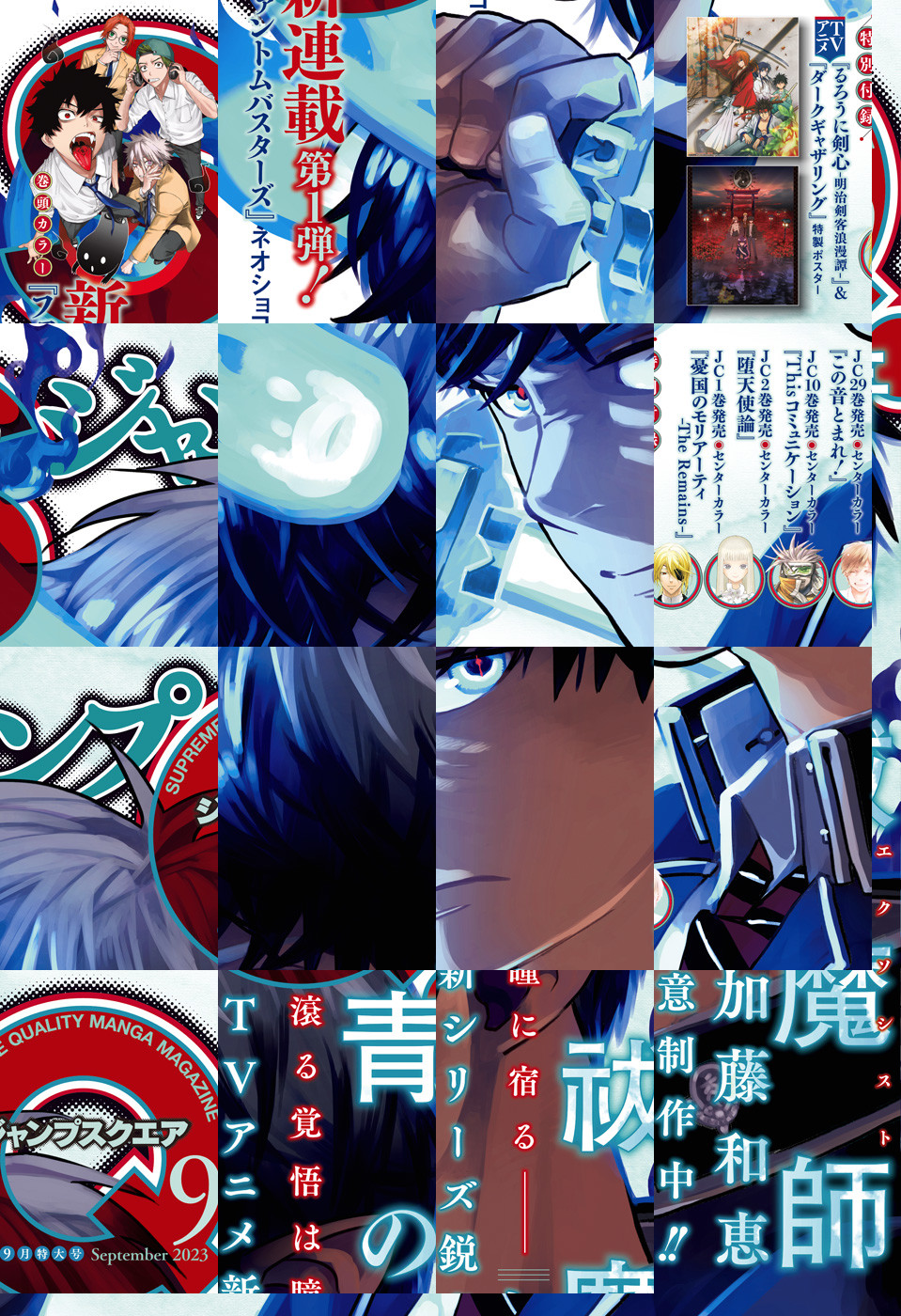 ※「ジャンプSQ.」デジタル版には、紙版の付録は付属しません。ご了承ください。/「ジャンプSQ. 2023年9月号」、紙と同時に配信!/【表紙】『青の祓魔師』(加藤和恵)/【新連載&巻頭カラー】『ファントムバスターズ』(ネオショコ)/【センターカラー】『憂国のモリアーティ-The Remains-』(原作:埼田要介 漫画:三好輝)、『この音とまれ!』(アミュー)、『Thisコミュニケーション』(六内円栄)、『堕天使論』(くろは)/【特別読切】『たんたんたぬきの田野貫さん』(岡林ゆうき)、『テルミーラストメッセージ』(図木ホトリ)/【特別付録】TVアニメ『るろうに剣心―明治剣客浪漫譚―』&『ダークギャザリング』特製ポスター(デジタル版はイラストとして巻末に収録)/ほか、14作品を収録!