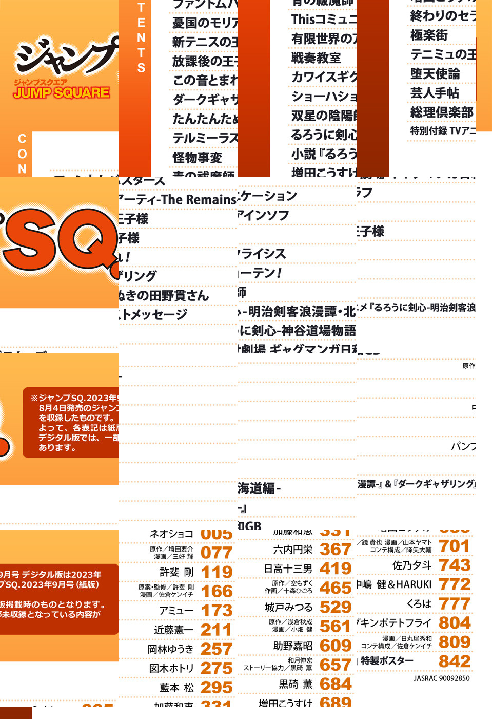 ※「ジャンプSQ.」デジタル版には、紙版の付録は付属しません。ご了承ください。/「ジャンプSQ. 2023年9月号」、紙と同時に配信!/【表紙】『青の祓魔師』(加藤和恵)/【新連載&巻頭カラー】『ファントムバスターズ』(ネオショコ)/【センターカラー】『憂国のモリアーティ-The Remains-』(原作:埼田要介 漫画:三好輝)、『この音とまれ!』(アミュー)、『Thisコミュニケーション』(六内円栄)、『堕天使論』(くろは)/【特別読切】『たんたんたぬきの田野貫さん』(岡林ゆうき)、『テルミーラストメッセージ』(図木ホトリ)/【特別付録】TVアニメ『るろうに剣心―明治剣客浪漫譚―』&『ダークギャザリング』特製ポスター(デジタル版はイラストとして巻末に収録)/ほか、14作品を収録!
