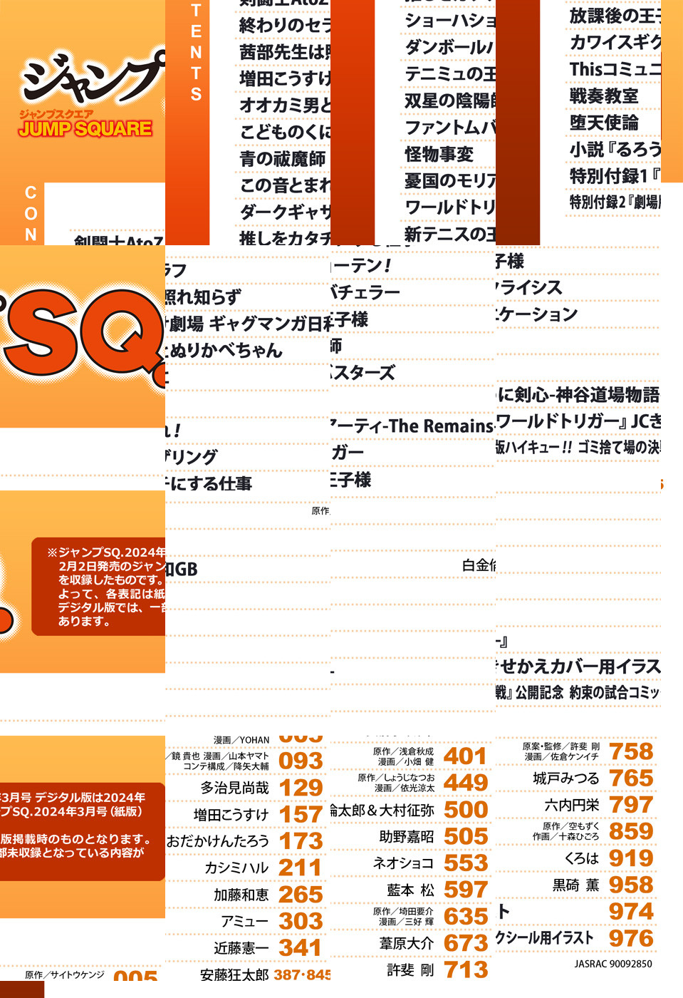 ※「ジャンプSQ.」デジタル版には、紙版の付録は付属しません。ご了承ください。/「ジャンプSQ. 2024年3月号」、紙と同時に配信!/【表紙】『ワールドトリガー』(葦原大介)/【新連載&巻頭カラー】『剣闘士AtoZ』(原作:サイトウケンジ 漫画:YOHAN)/【センターカラー】『オオカミ男とぬりかべちゃん』(おだかけんたろう)、『この音とまれ!』(アミュー)、『双星の陰陽師』(助野嘉昭)、『憂国のモリアーティ-The Remains-』(原作:埼田要介 漫画:三好輝)、『戦奏教室』(原作:空もずく 作画:十森ひごろ)/【特別付録】『ワールドトリガー』JCきせかえカバー、『劇場版ハイキュー!! ゴミ捨て場の決戦』公開記念 約束の試合コミックシール(デジタル版はイラストとして巻末に収録)/ほか、16作品を収録!