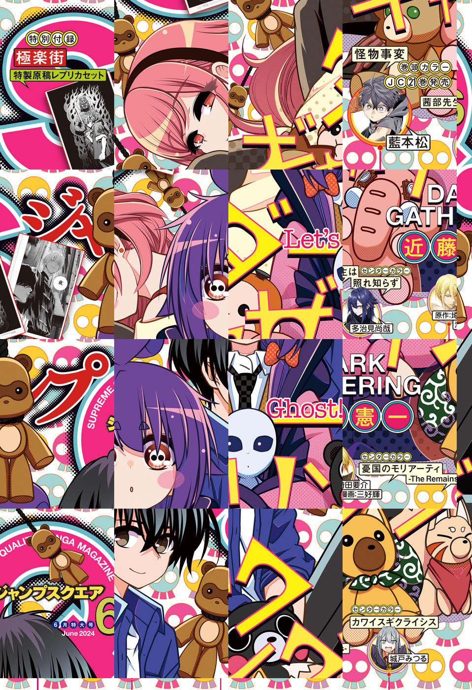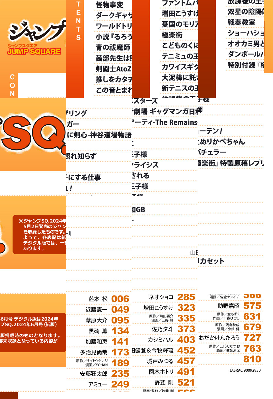 ※「ジャンプSQ.」デジタル版には、紙版の付録は付属しません。ご了承ください。/「ジャンプSQ. 2024年6月号」、紙と同時に配信!/【表紙】『ダークギャザリング』(近藤憲一)/【巻頭カラー】『怪物事変』(藍本松)/【センターカラー】『茜部先生は照れ知らず』(多治見尚哉)、『憂国のモリアーティ-The Remains-』(原作:埼田要介 漫画:三好輝)、『カワイスギクライシス』(城戸みつる)/【特別読切】『大泥棒に託される』(図木ホトリ)/【特別付録】『極楽街』特製原稿レプリカセット(デジタル版はイラストとして巻末に収録)/ほか、16品を収録!