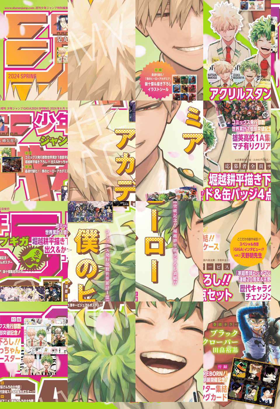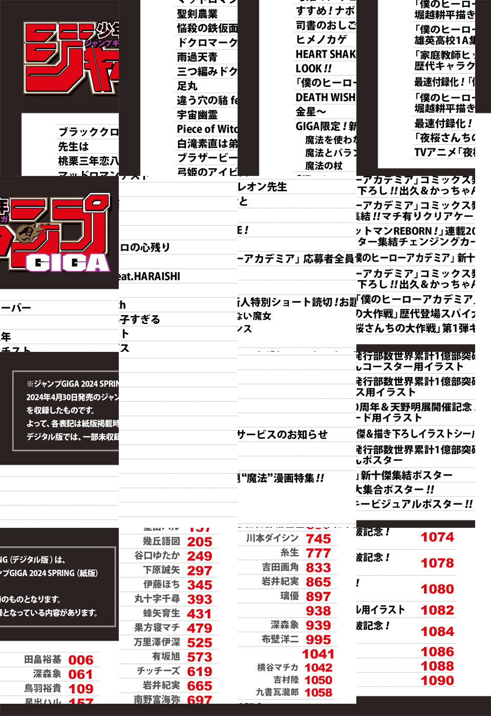 ※「ジャンプGIGA」デジタル版には、紙版の付録は付属しません。応募者全員サービスのご応募はアプリ版の少年ジャンプ+、アプリ版のゼブラックからのみ可能です。ご了承ください。/週刊少年ジャンプ特別編集増刊「ジャンプGIGA 2024 SPRING」、紙と同時に配信!/【巻頭カラー】『ブラッククローバー』(田畠裕基)/【センターカラー】『足丸』(蜂矢育生)/【付録】最速付録化!『僕のヒーローアカデミア』新十傑&描き下ろしイラストシール、『僕のヒーローアカデミア』コミックス発行部数世界累計1億部突破記念!雄英高校1A集結!!マチ有りクリアケース、最速付録化!『僕のヒーローアカデミア』新十傑集結ポスター、『僕のヒーローアカデミア』コミックス発行部数世界累計1億部突破記念!堀越耕平描き下ろし!!出久&かっちゃんコースター、『僕のヒーローアカデミア』コミックス発行部数世界累計1億部突破記念!堀越耕平描き下ろし!!出久&かっちゃんポスター、『家庭教師ヒットマンREBORN!』連載20周年&天野明展開催記念!歴代キャラクター集結チェンジングカード、『夜桜さんちの大作戦』歴代登場スパイ大集合ポスター!!、TVアニメ『夜桜さんちの大作戦』第1弾キービジュアルポスター!!(デジタル版はイラストとして巻末に収録)/ほか、多数の新作読切を掲載!