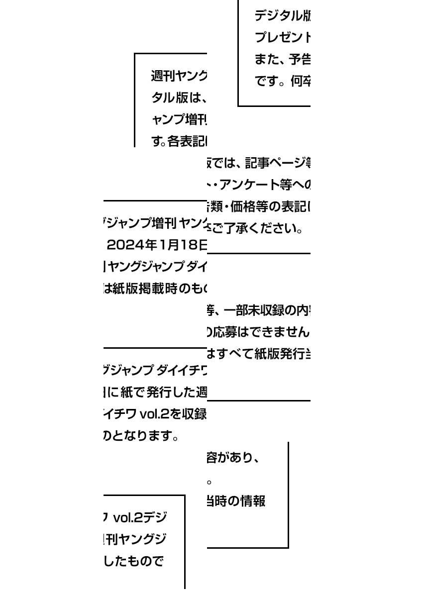 【本号のデジタル版では特別企画「[ゴールデンカムイ][【推しの子】]第一話まるごとデジタル原稿プリントセット―YJC収録版― 応募者全員大サービス」のご応募は出来ません。また、特別付録「[ゴールデンカムイ]北の大地の名画 イラストカード&ポストカード<樺太・雨竜川編>」、「[【推しの子】]B小町FC会員証風ICカードステッカー」、「[【推しの子】]両面スペシャルポスター」は収録されておりません。あらかじめご了承ください。】※デジタル版ヤングジャンプ ダイイチワは、紙版の同号より未掲載のコンテンツがございます。試し読みファイルのデジタル版目次や注意書きをご確認の上ご購入ください。/週刊ヤングジャンプ増刊「ヤングジャンプ ダイイチワ」、紙と同時に配信!/【表紙】『【推しの子】』(赤坂アカ×横槍メンゴ)/【巻頭グラビア1】Liella!/【巻頭グラビア2】蓮ノ空女学院スクールアイドルクラブ/【新連載&巻頭カラー】『バグエゴ』(原作:ONE 作画:設楽清人)/【特別読切】『バツハレ 番外編』(稲葉みのり)、『ゴーリーは前しか向かない』(野田サトル)/【巻末グラビア】制コレ22/さらに、ダイイチワグランプリエントリー作品18作を掲載!