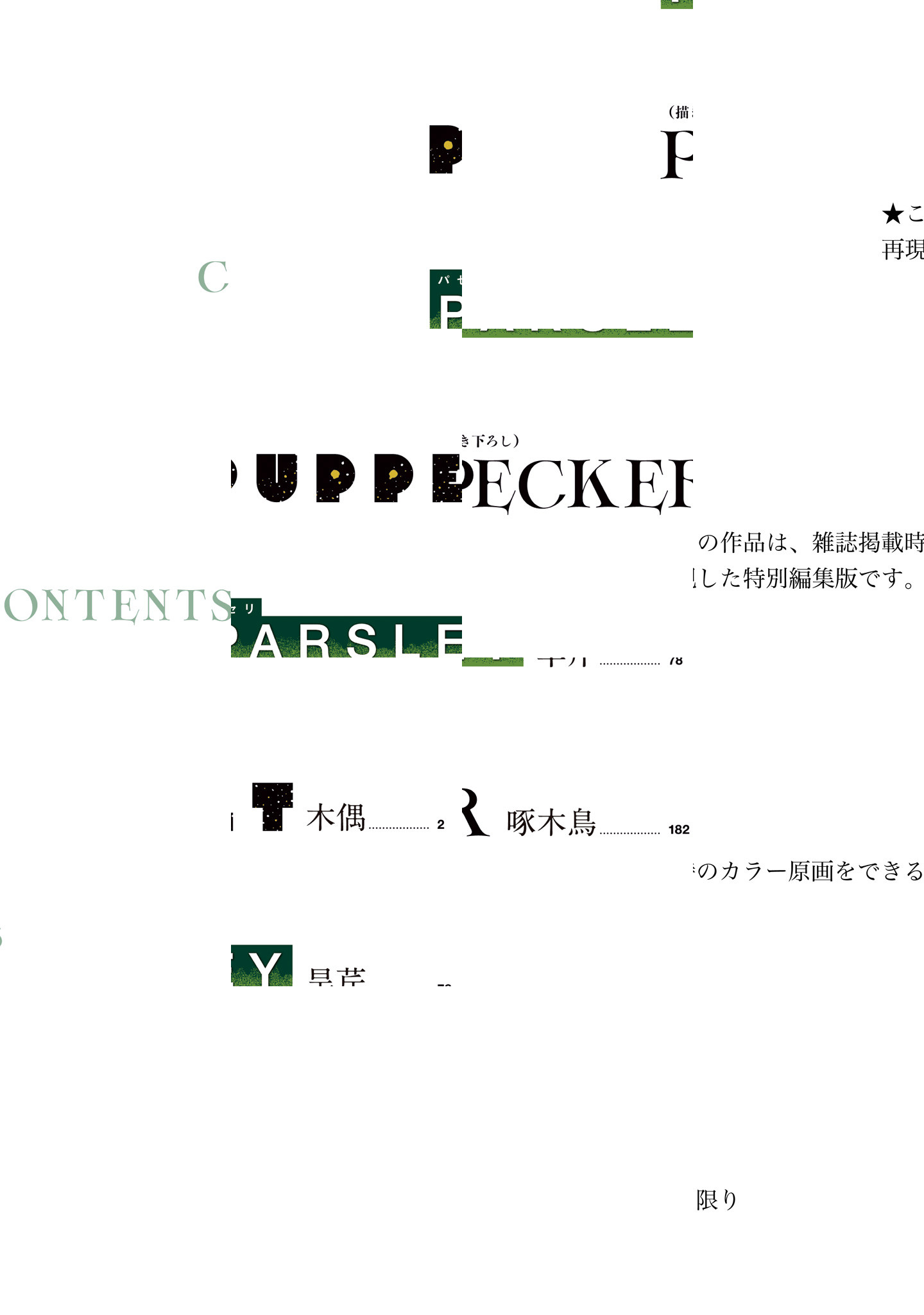 男女両役を“男子だけでこなす”歌劇を学ぶ――ユニヴェール歌劇学校。クォーツ、オニキス、ロードナイト、アンバー4つのクラスが鎬を削り、己を昇華してゆく。これは、舞台で一際眩い光を放つ存在へ挑む者たちの、枝葉の物語。そして、幹へと繋がる前日譚。(「PUPPET」「PARSLEY」収録)