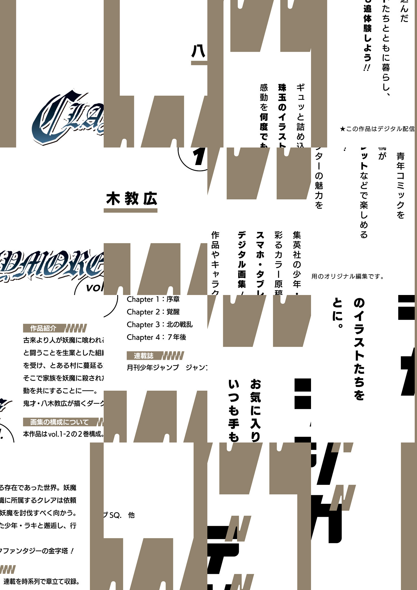 集英社の少年・青年コミックを彩るカラー原稿がスマホ・タブレットなどで楽しめるデジタル画集! 妖魔と闘うことを生業とした組織に所属するクレアは、家族を妖魔に殺された少年・ラキと邂逅し、行動を共にすることに――。ダークファンタジーの金字塔『CLAYMORE』。アナログ原稿をデジタル化! レアなイラストも満載して全2巻で登場!