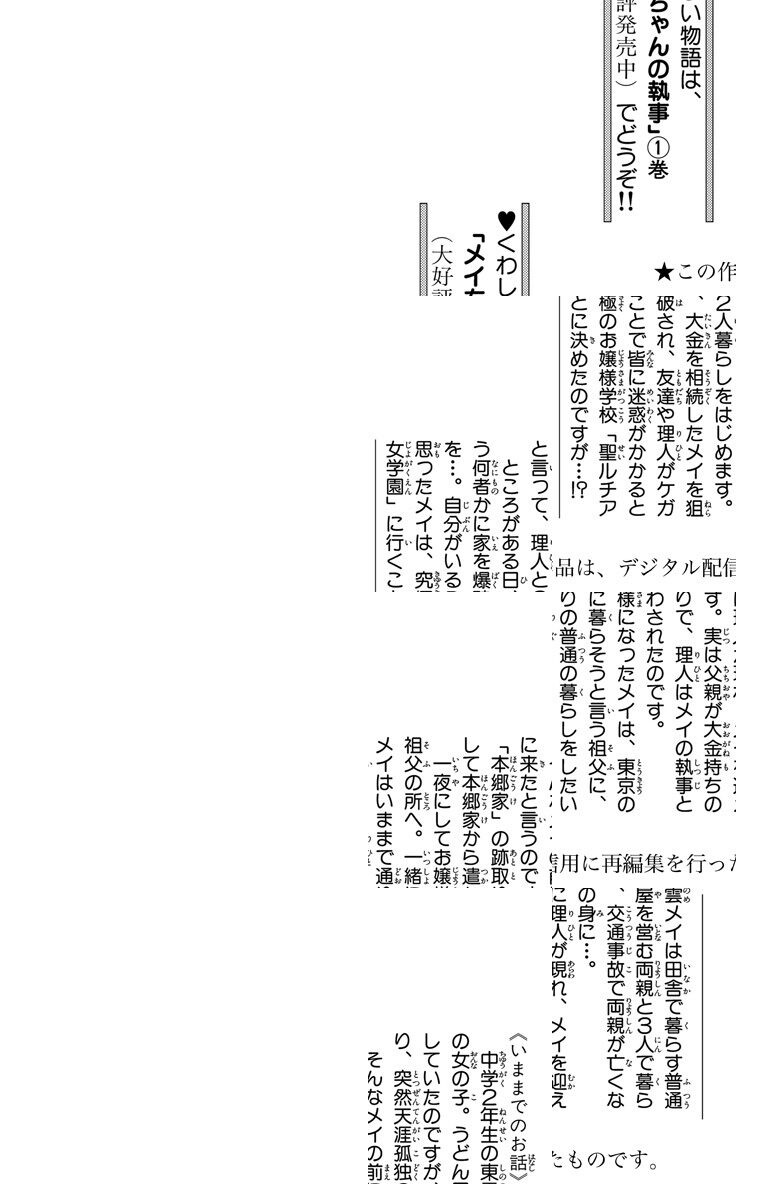 ※2025年12月27日までの期間限定無料お試し版です。2025年12月28日以降はご利用できなくなります。【逆ハー日和!? 愛されすぎて困ります!】お仕えします、メイお嬢様。主人公、メイが両親を事故で亡くした夜、突然、理人という青年があらわれたのでございます。メイを「お嬢様」と呼び、自分はその執事だというのです。なんと、メイの父親は、実は大金持ちの跡継ぎで、メイはその遺産の全てを引き継ぐことになったのです。一夜にして、お嬢様になってしまったメイの運命やいかに。お嬢様と僕の間に生まれる「愛」にご注目ください。