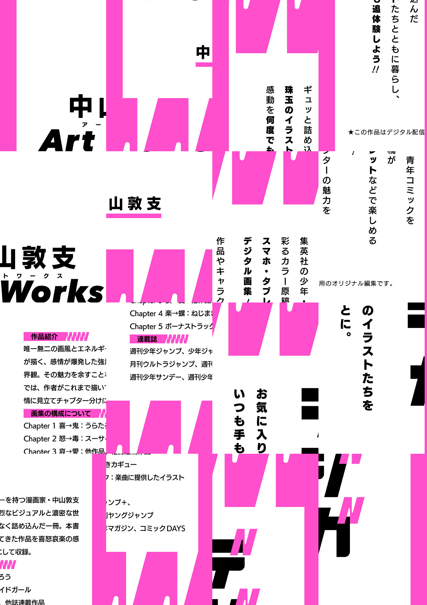 集英社の少年・青年コミックを彩るカラー原稿がスマホ・タブレットなどで楽しめるデジタル画集! 唯一無二の画風とエネルギーを持つ漫画家・中山敦支が描く、感情が爆発した強烈なビジュアルと濃密な世界観を凝縮。作品別に集約したカラーイラストを“喜怒哀楽”の章立てで収録し、集英社刊行以外の作品や楽曲提供イラストも掲載。出版社やジャンルの垣根を越え、これまで作者が生み出した創作の歩みを大ボリュームで収めたデジタル画集。