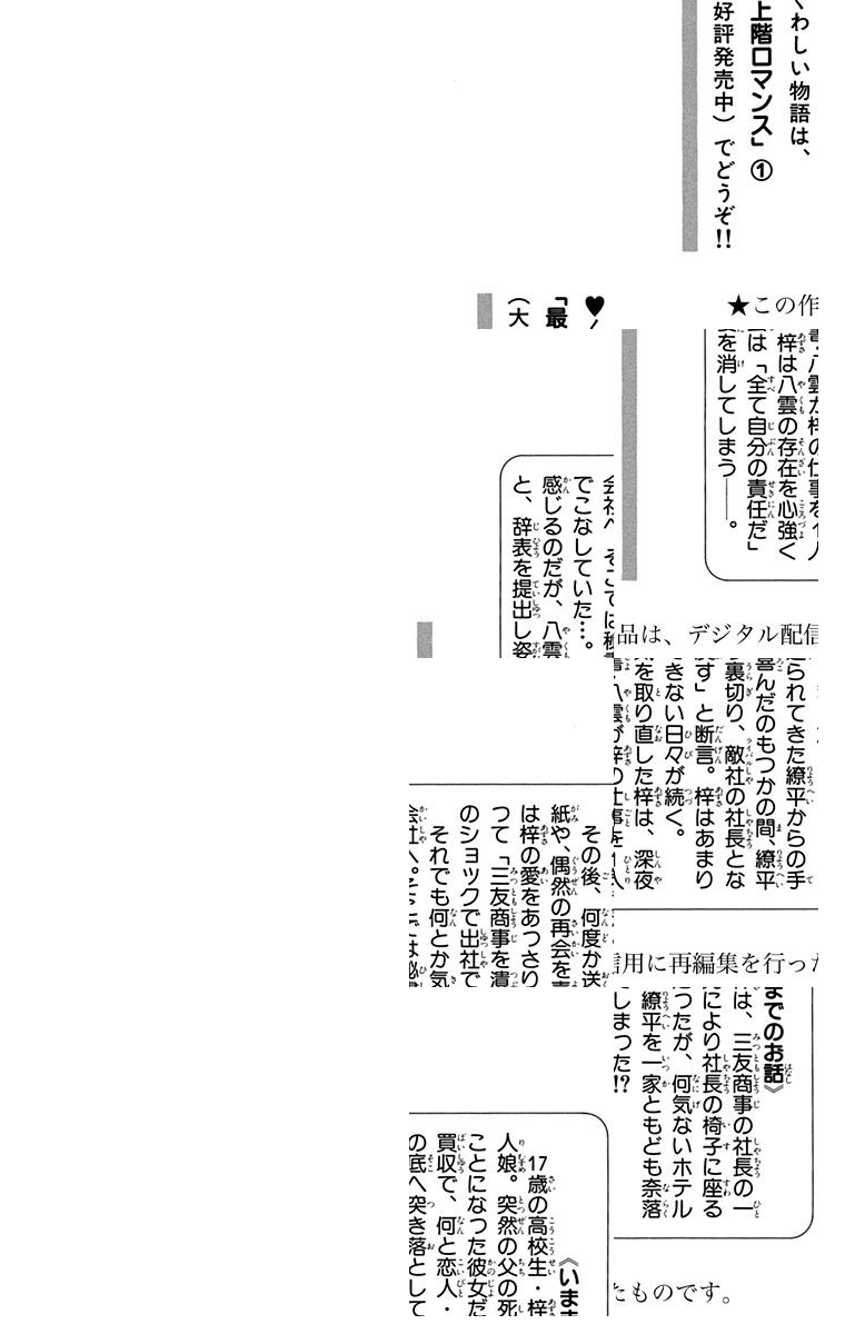 【平凡な女子高生、社長就任!】七瀬梓はごくふつうの女子高生。だがある日突然、父の死によって三友商事社長の椅子に座ることに! 梓は厳しくも忠実な社長秘書・八雲に支えられ社長業務をこなすが、何気ないホテル買収で、恋人・繚平を一家ともども奈落の底へ突き落してしまった…!? ジェットコースターのようなドラマチック・ラブロマンス、第1巻!!