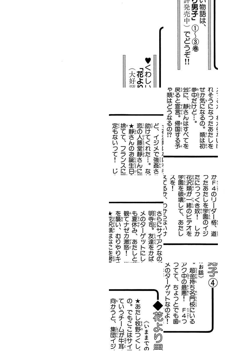 <完結済み>牧野つくしが入ったのは超金持ち名門高校。でも、そこはサイアクな所だった。F4ってチームが牛耳って、ちょっとでも歯向かうと集団イジメ! ぶち切れたつくしはF4の道明寺司にケリを入れてしまい…!?
