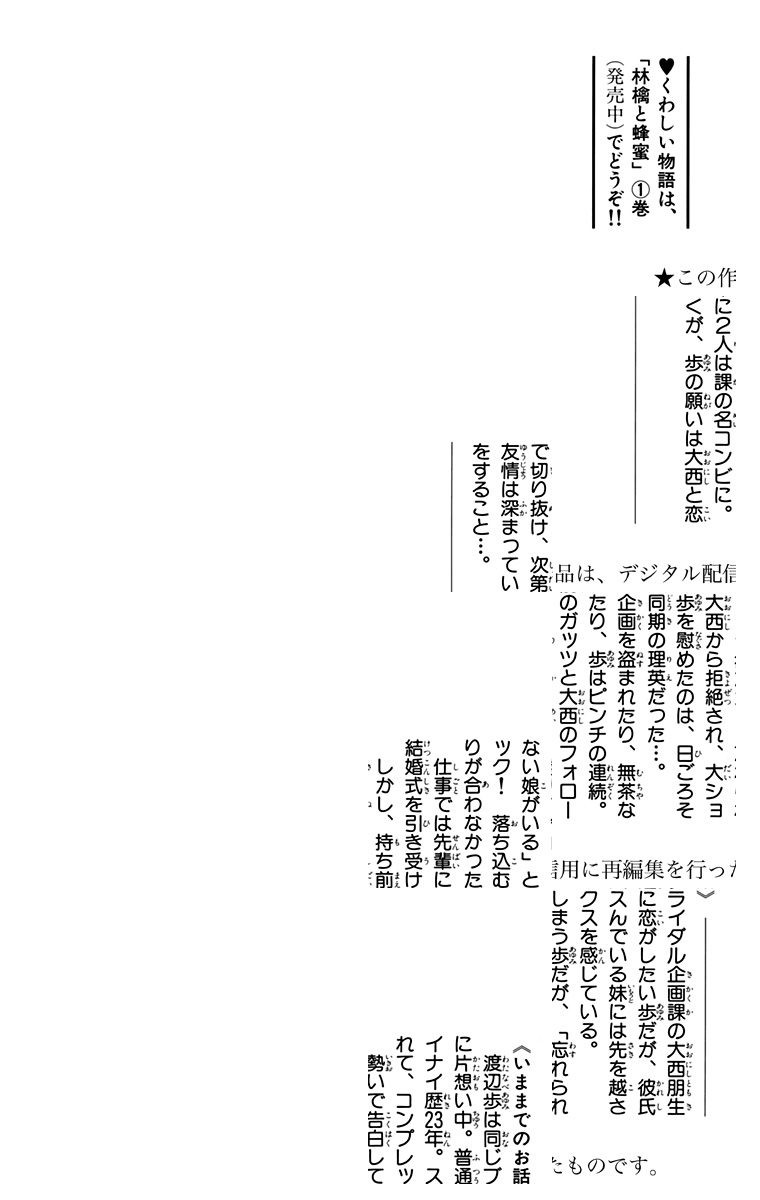 渡辺歩は23歳。同じブライダル企画課の同期・大西朋生に片想い中。普通に想って想われる恋がしたい歩だけど、つきあったことが無いというコンプレックスがあり…?
