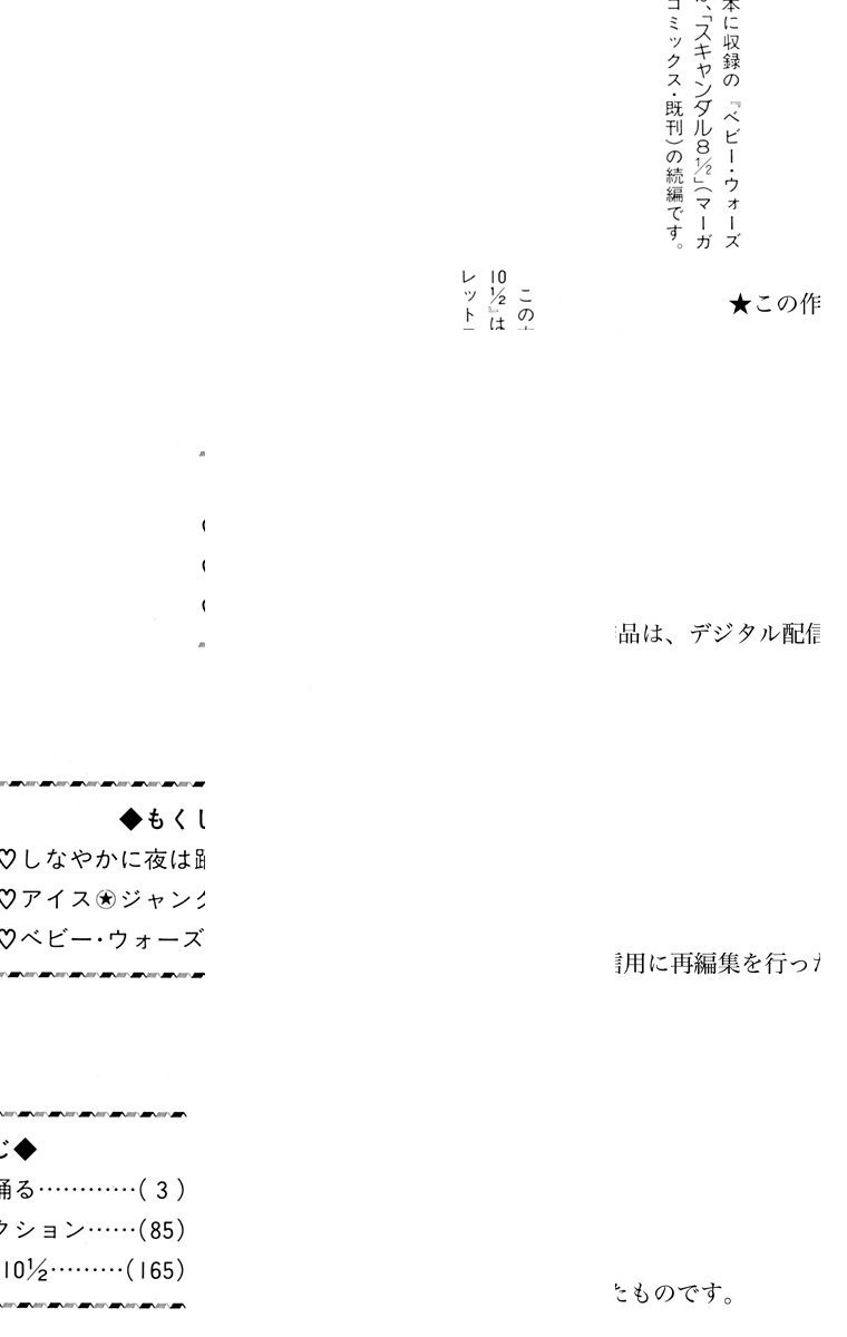 【文緒とゼブラの踊る恋模様】男に殴られぼろぼろの文緒はクラブ「ホットステップス」に流れ着く。そこでダンサー志望のゼブラと出会い、彼らのダンスに励まされる。北海道へ帰るチケットを無くした文緒は、ゼブラの部屋に居候しながら「ホットステップス」で働くことに!! ダンサーになる夢を、ゼブラは叶えることができるのか!? 他『アイス★ジャンクション』『ベビー・ウォーズ10 1/2』も収録。