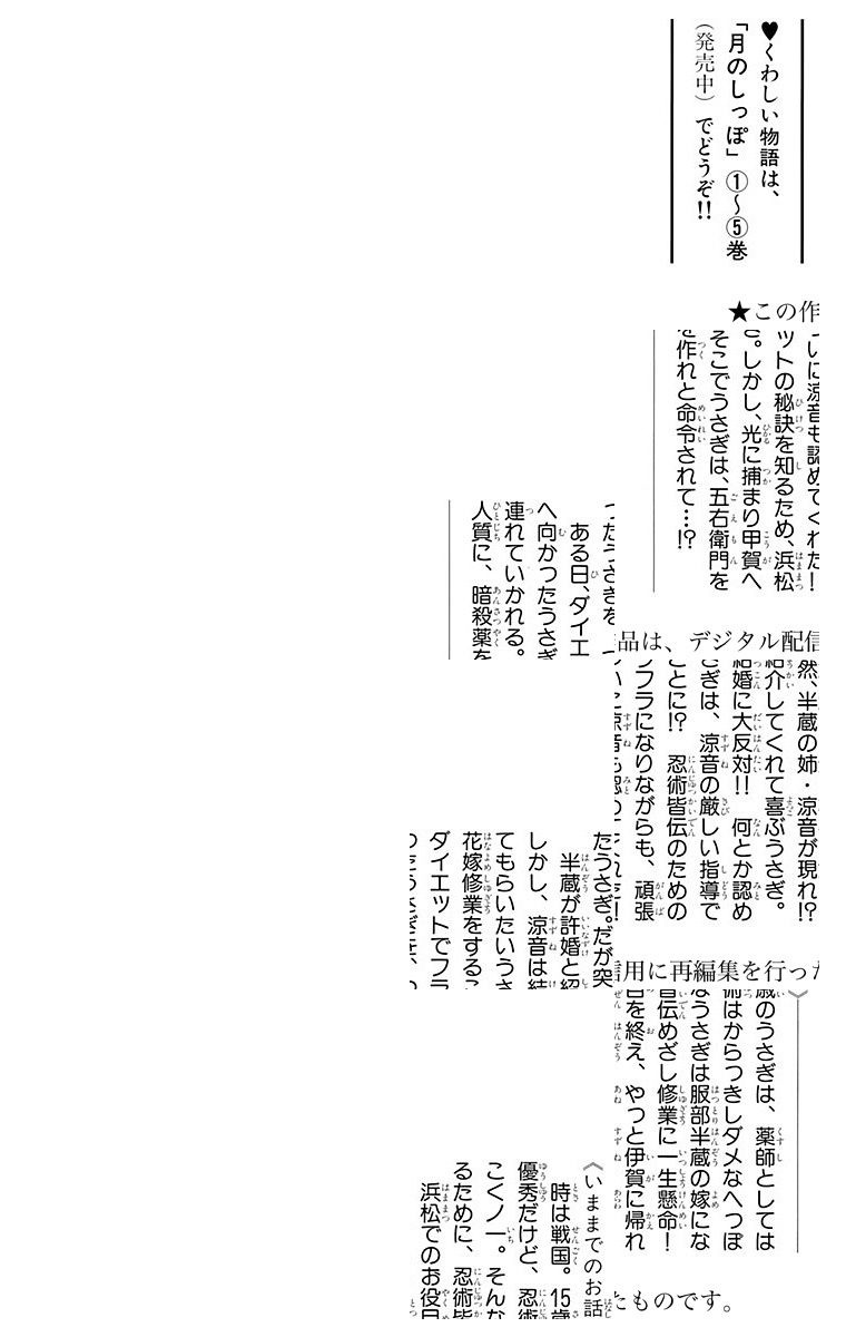 15歳のうさぎは、未だ忍術皆伝できない、へっぽこくノ一。そんなうさぎのお役目は、伊賀で一番の男前・服部半蔵の嫁になること。さっそく半蔵に会いに行ったうさぎ。でも…!?