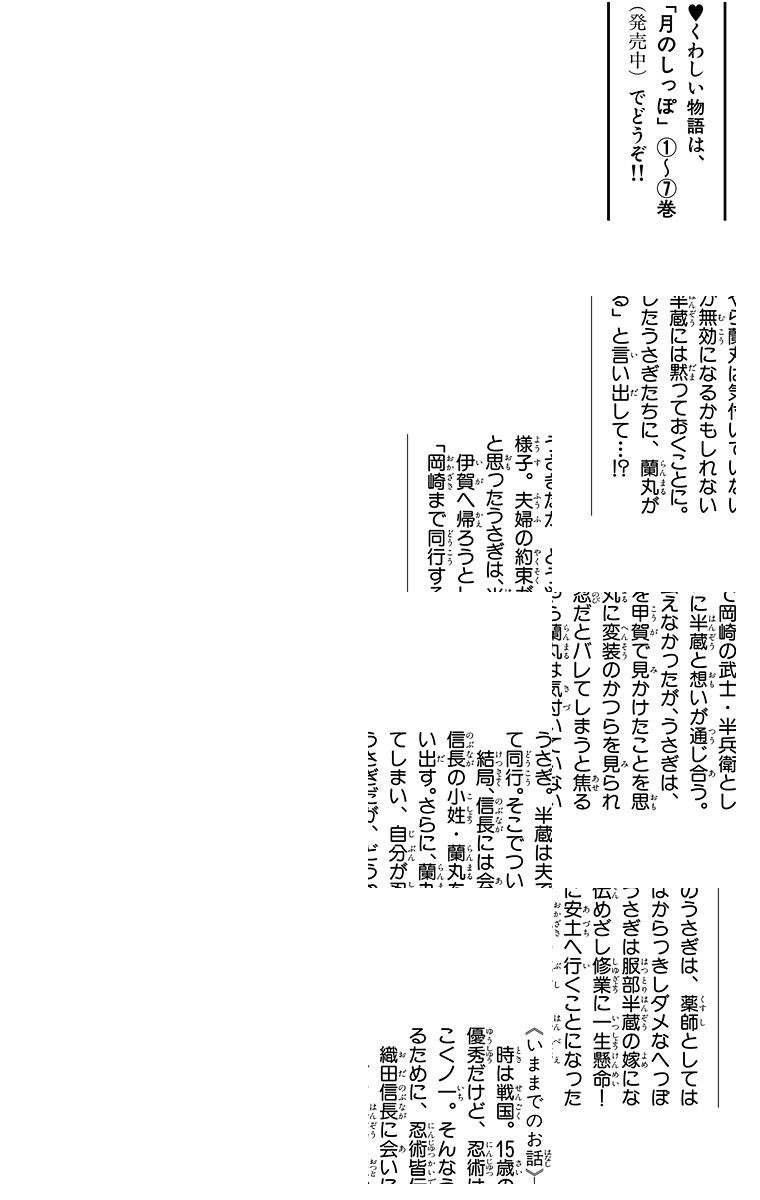 15歳のうさぎは、未だ忍術皆伝できない、へっぽこくノ一。そんなうさぎのお役目は、伊賀で一番の男前・服部半蔵の嫁になること。さっそく半蔵に会いに行ったうさぎ。でも…!?