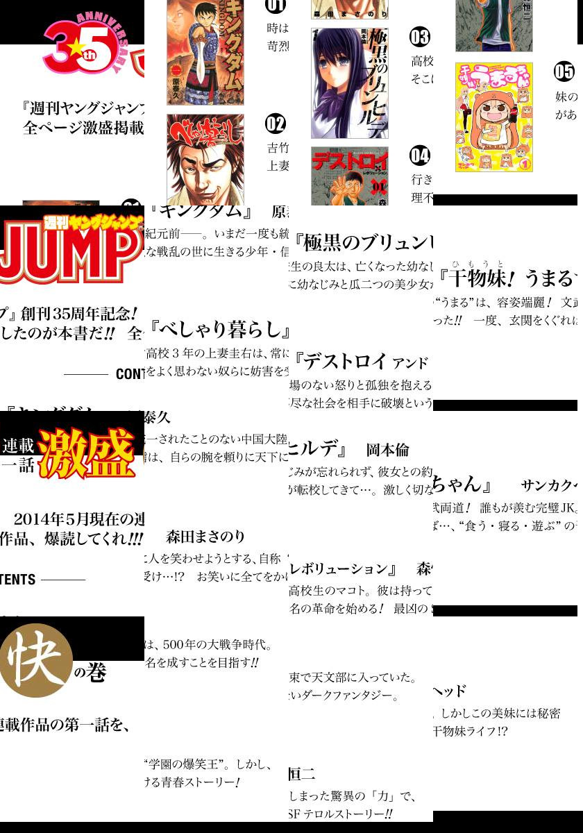 各巻超ボリューム400p~! 「週刊ヤングジャンプ」連載の28作品第一話を、「快・進・撃」の3冊に分けて収録!! 【快の巻・収録9作品】破格のスケールで描かれる戦国中華大活劇『キングダム』(原泰久)/漫才で日本一のお笑いを目指す『べしゃり暮らし』(森田まさのり)/“研究所”から抜け出した魔法使いとの逃避行『極黒のブリュンヒルデ』(岡本倫)/『デストロイ アンド レボリューション』(森恒二)/『干物妹!うまるちゃん』(サンカクヘッド)/『かくりよものがたり』(藤崎竜)/『ボクガール』(杉戸アキラ)/『横浜線ドッペルゲンガー』(玉木ヴァネッサ千尋)/『リクドウ』(松原利光)