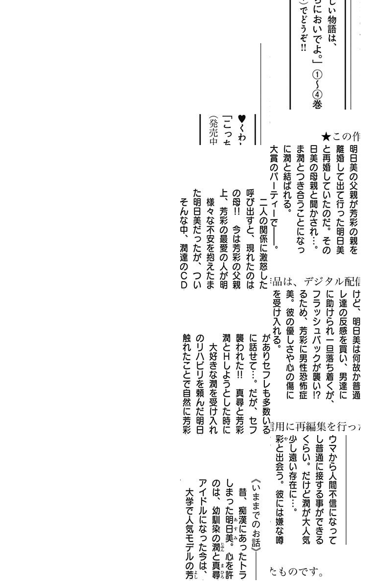 「俺がずっとず──っと守ってやるよ」 「片思い同士 慰めあお?」 過去のトラウマから、人間不信になってしまった明日美。男の人なんて、特に苦手のはずが同じ大学に通う人気モデル芳彩とは、なぜかすんなり話すことが出来てビックリ! でも、芳彩には嫌な噂がたくさんあるみたいで…!?