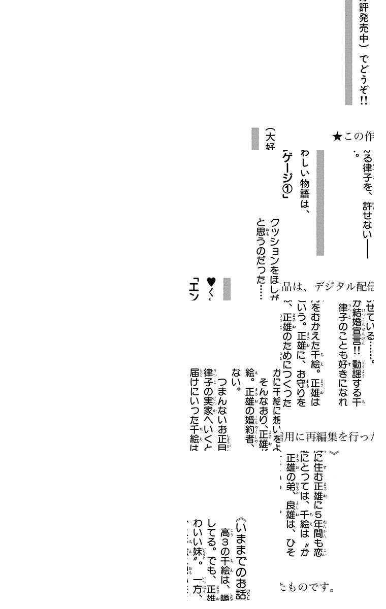 【いくえみ綾・80's☆みずみずしい少女マンガ】高校3年生の千絵は、5歳年上のお隣の正雄にーちゃんが大好き。正雄の弟、良雄は、ひそかに千絵に想いを寄せている。でも、正雄は…見も知らぬ「婚約者」を連れてきた!?