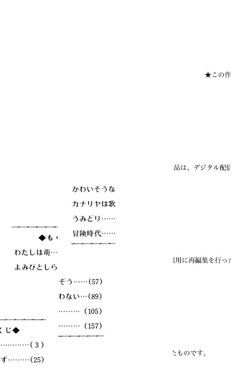 【人の悲しみを包みこみ、幸せをもたらす萌の愛とは…?】“青い鳥”という店につとめる萌(もえ)の願いは、幸せな人たちをたくさん見ること。そんな心やさしい萌自身にも、好きな人と再会するという幸せな偶然がおとずれるが…。 【同時収録】よみびとしらず/かわいそうなぞう/カナリヤは歌わない—幸のメルヘン—/うみどり/冒険時代
