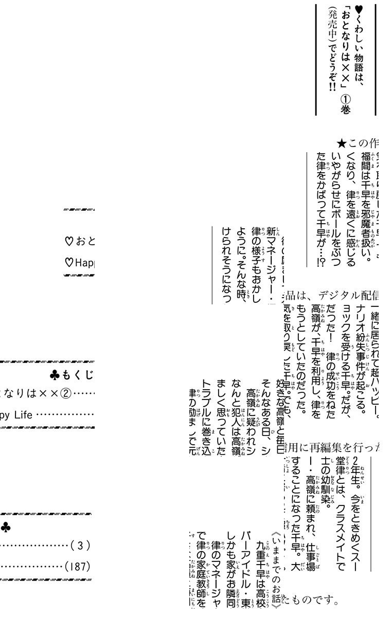 超人気アイドルの東堂律。実は私九重千早は、カレのおとなりさんで幼なじみなんです! しかも、私がラブなマネージャーの高嶺さんに、律の家庭教師を頼まれて!?
