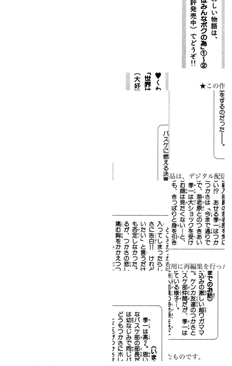 【自信過剰男の恋が空回り】幼なじみのキイチ(季一)とつかさはバスケ大好き高校生の男女。ひとつの布団に寝たって平気なんだけど、実はキイチはかなり複雑だ。ある日2人のクラスにメチャ可愛い転入生の亜子(あこ)が来て、キイチに突然抱きついた! これって運命? お調子者キイチの自己チュー・ラブ騒動記、第1巻。