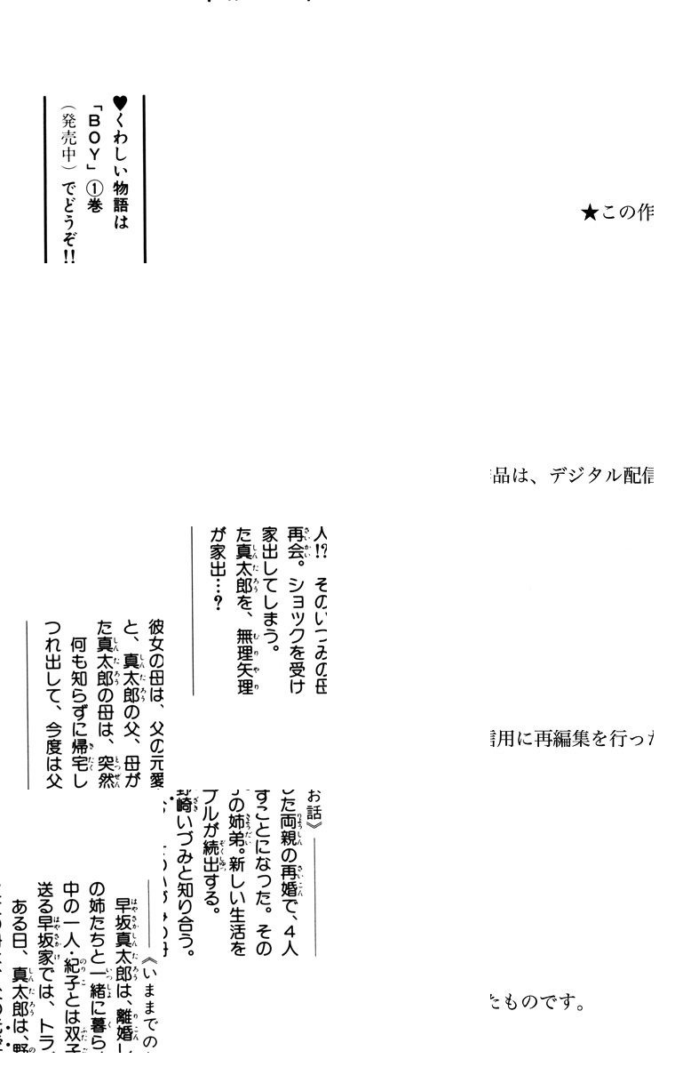 【母や姉たちと再会した16歳・真太郎の混乱!】離婚した両親の再婚で共に暮らすことになった5人の姉弟たちは日々困惑の真っ只中。特に末っ子の双子、真太郎と紀子は顔がそっくり同じこともあって問題続出だ。女性下着が散乱する部屋で真太郎の怒りがついに炸裂してしまう…。戸惑いながらも絆をつむぐ再生家族の物語、第1巻。