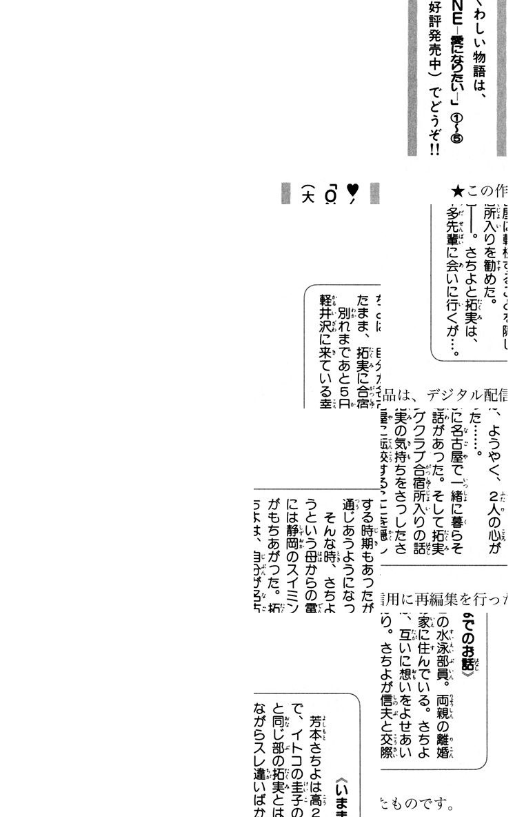 【友達のままでいいの?】芳本さちよは高校1年生。家庭の事情で、いとこの圭子の家で暮らす身の上だが、水泳部ではつらつ活動中。はじめは幸多先輩に憧れていたけど、同級生の拓実のやさしさに気づき、ほのかな恋が芽生える。ところが圭子も拓実を好きで、さちよの恋は前途多難に! 内気な女の子の切ない恋が始まる第1巻!