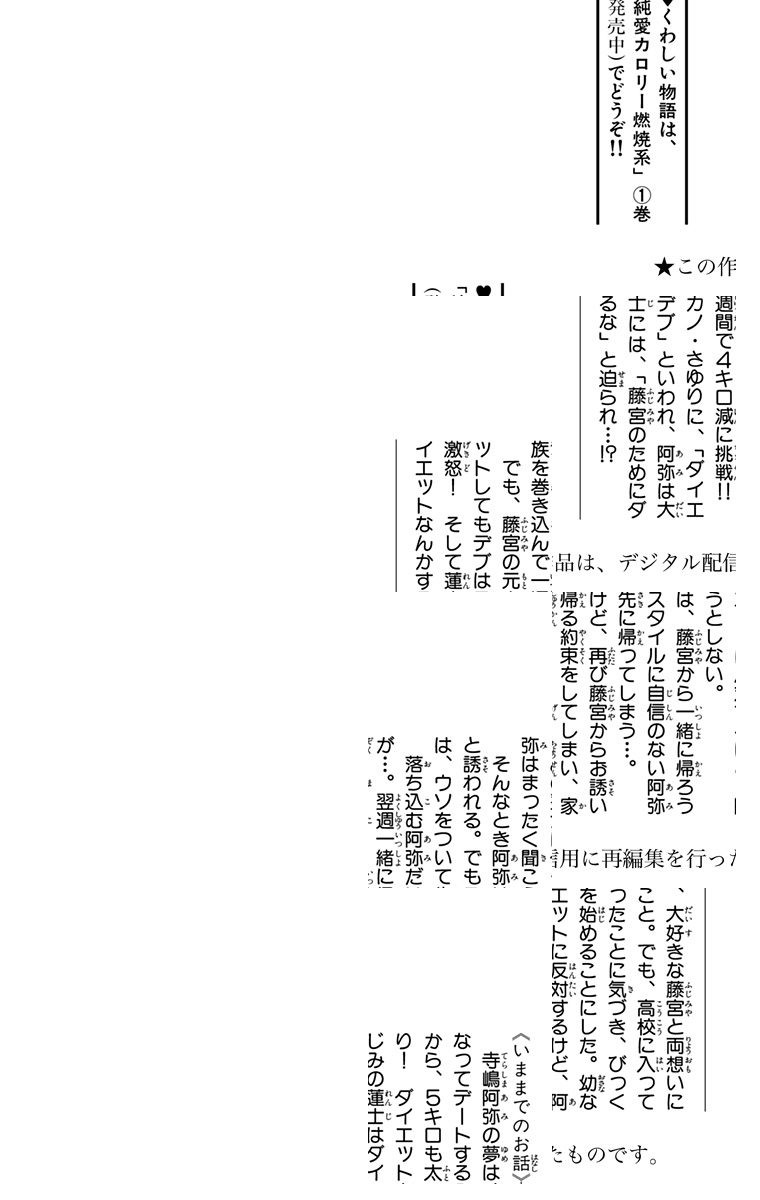阿弥は食べることが大好きな高校1年生。かわいい制服に憧れて入学したのに、なんと…5キロも太ってて夏服が入らない…。憧れの藤宮に嫌われないためにも、目指すは理想の46キロ!! 【同時収録】純愛カロリーHG系